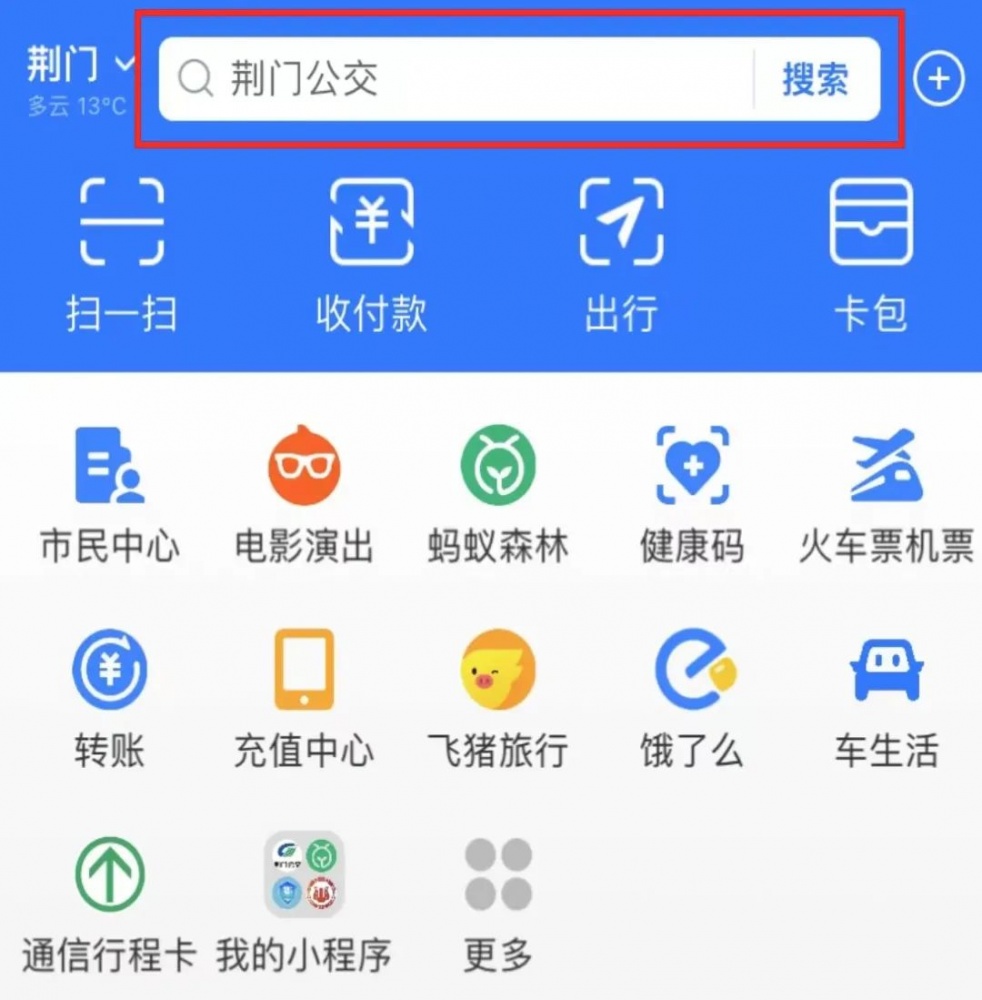 01 打開“支付寶APP”,首頁搜【荊門公交】