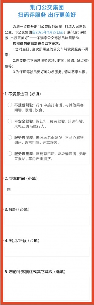 市民乘客可通過掃描公交車上的“服務(wù)監(jiān)督二維碼”,進(jìn)入“不滿意公交駕駛員監(jiān)督舉報(bào)”頁(yè)面,填寫詳細(xì)舉報(bào)信息(評(píng)價(jià)頁(yè)面如下)。